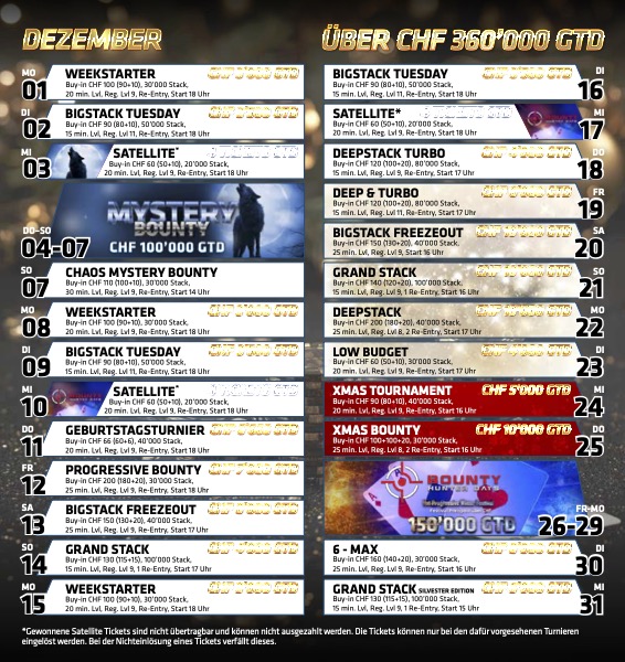 Heute geht es im Grand Casino Liechtenstein um 17:00 Uhr weiter mit dem CHF 180+20 Deepstack. Gespielt wird mit 40.000 Start Stack und 25 Minuten Blind Levels.
