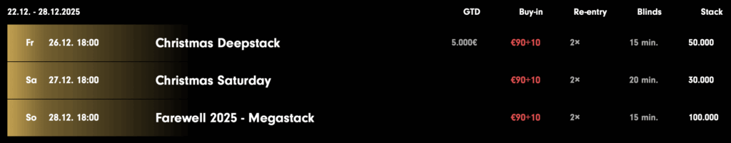 Und es geht weiter: Heute steht im GCA der dritte Teil der Christmas-Turnierreihe auf dem Plan – das €90+10 Christmas Saturday. Jeder Starter beginnt mit 30.000 Chips, und während des Turniers sind zwei Re-Entries erlaubt. Gespielt wird mit 20-Minuten-Blind-Levels.