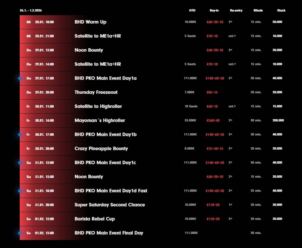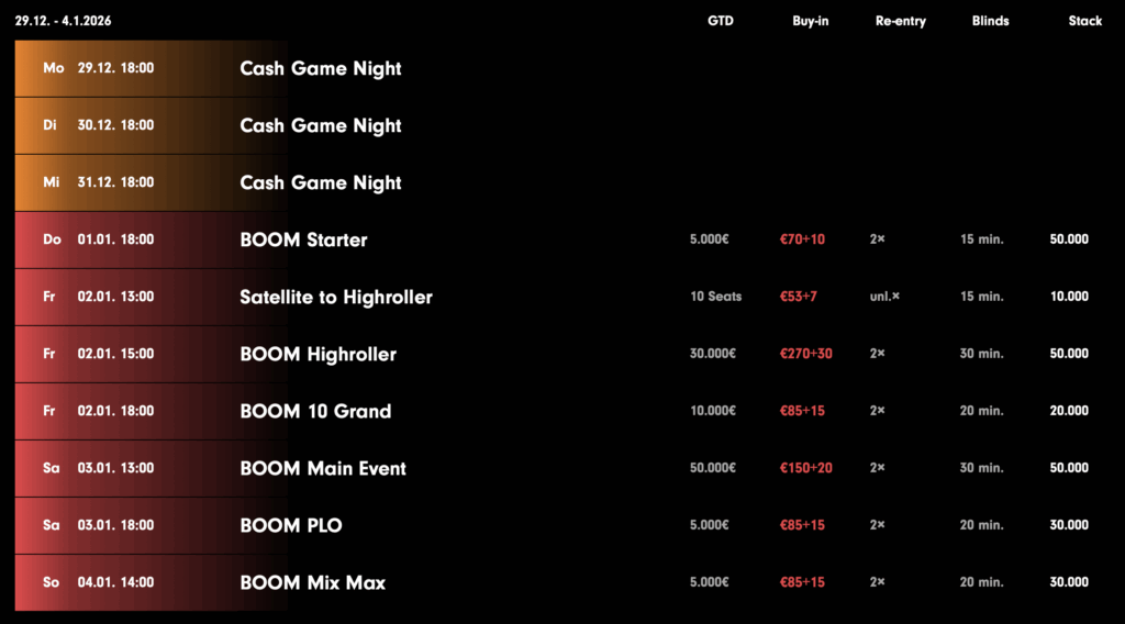 Das BOOM Festival läuft noch bis zum 5. Januar und umfasst insgesamt sieben Turniere. Highlight der Serie ist das €170 Main Event, das am Samstag ausgetragen wird und mit einer Garantie von €50.000 im Mittelpunkt des Programms steht.