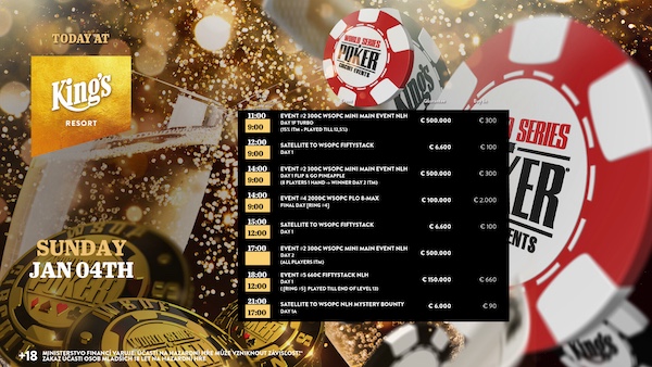 Das zweite Ring-Event der WSOPC im King’s Resort Rozvadov ist das €300 WSOPC Mini Main Event NLH mit einer Garantie von €500.000. Gespielt wird über sechs reguläre Starttage sowie einen zusätzlichen Flip & Go Flight, bevor es heute in Tag 2 und morgen in den Finaltag geht.