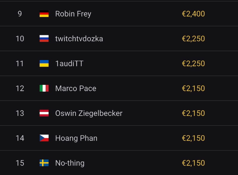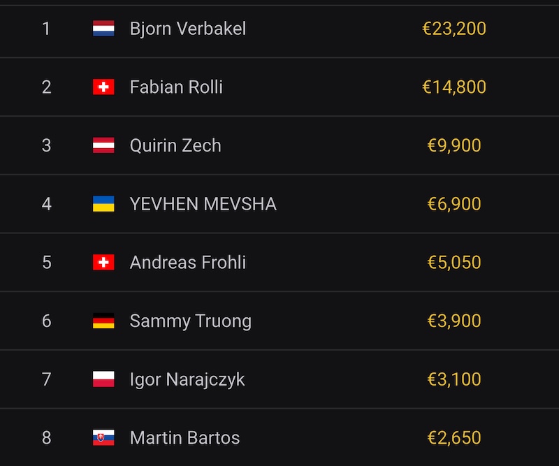 Nach einem langen Tag Poker standen am Ende 15 Spieler, die für ihre Leistungen eine Auszahlung erhielten. Der Österreicher Oswin Ziegelbecker, der mit dem größten Stack in den zweiten Tag gestartet war, musste sich schließlich auf Platz 13 für €2.150 verabschieden. Auch bekannte Namen wie der Schweizer Andreas Fröhli (Platz 5, €5.050) und der Österreicher Quirin Zech (Platz 3, €9.900) fanden sich weit vorne in der Endabrechnung wieder.