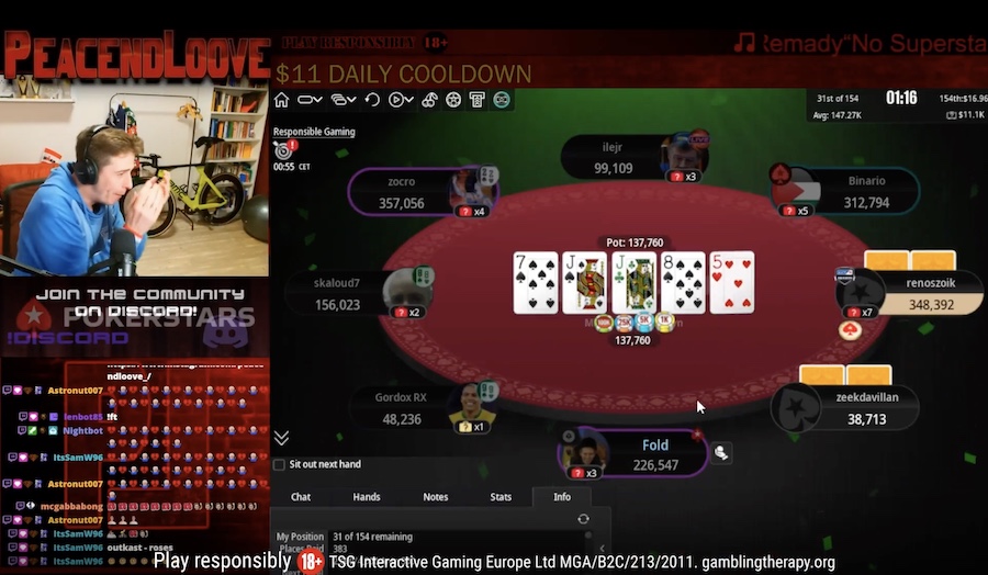 Die Ausgangslage war perfekt: Huber hielt 10♠9♠. Das Board brachte J♣ J♠ 7♠ 8♠ – und damit einen Straight Flush, also die absoluten Nuts. Im Stream machte Huber noch scherzhafte Kommentare zu seiner Hand, nichts deutete auf das kommende Desaster hin.
