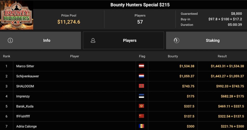 Zunächst hatten wir das $215 Bounty Hunter Special mit 57 Entries. Die $8.000 Garantie wurde deutlich übertroffen und es wurde um $11.274 gespielt. Die größte Auszahlung ging hier an den Österreicher Marco Sitter, der für den Sieg $1.443 plus $1.534 an Bounties erhielt.