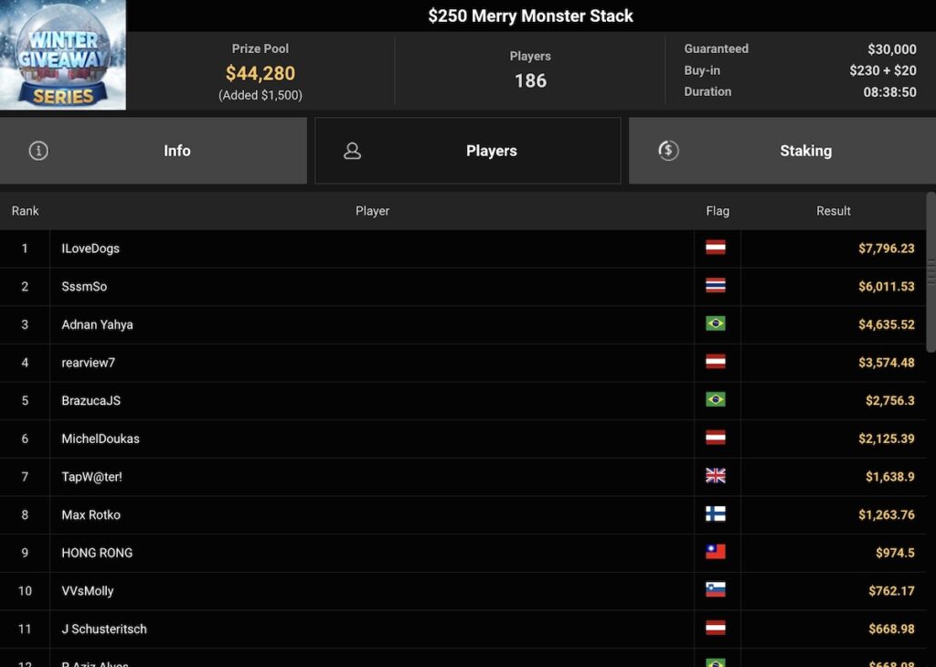 Im $250 Merry Monster Stack wurden $30.000 garantiert und 186 Entries schufen einen Preispool von $44.280. Hier war es ebenso ein Österreicher, der den größten Preis abstauben konnte. ‚ILoveDogs‚ kassierte $7.796 für den Sieg.