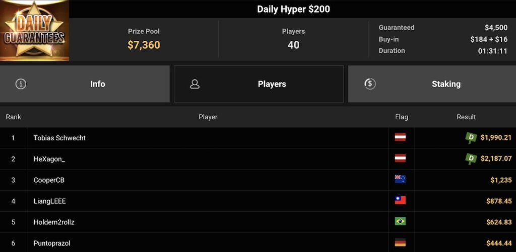 Das dritte Turnier im Bunde mit österreichischen Flaggen – ja, gleich zwei – war das $200 Daily Hyper, das 40 Entries an die Tische lockte. Die $4.500 Garantie wurde somit deutlich übertroffen und es wurde um $7.360 gespielt. Die beiden Österreicher ‚HeXagon_‚ und Tobias Schwecht einigten sich am Ende auf einen Heads-up Deal, wonach Ersterer die größere Auszahlung mit $2.187 erhielt, aber Letzterer als offizieller Sieger gekrönt wurde.