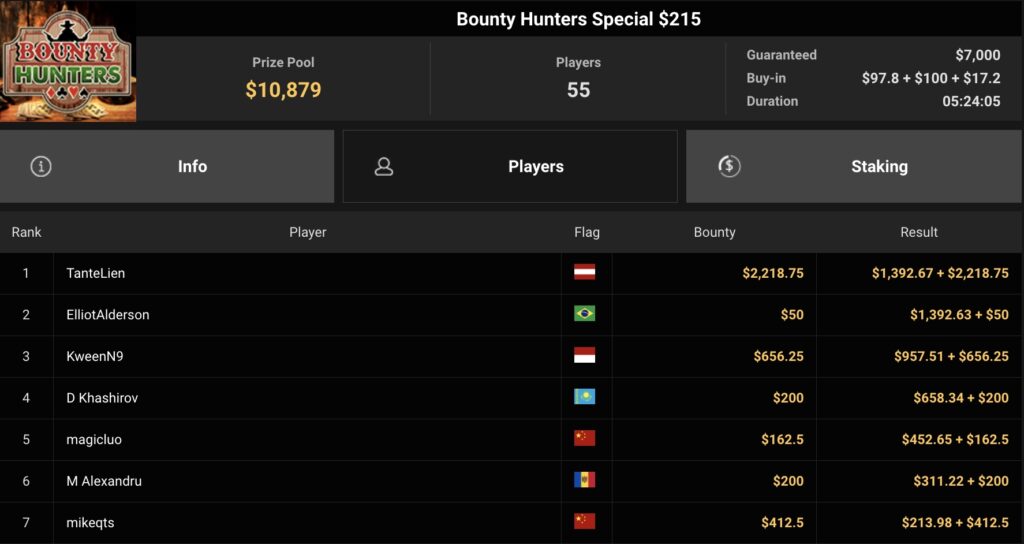 Fangen wir an mit dem $215 Bounty Hunters Special, das mit 55 Entries seine $7.000 Garantie deutlich überschreiten konnte. $10.879 gab es zu gewinnen und der größte Anteil im Wert von $1.392 plus $2.218 an Bounties ging an den Österreicher ‚TanteLien‚.