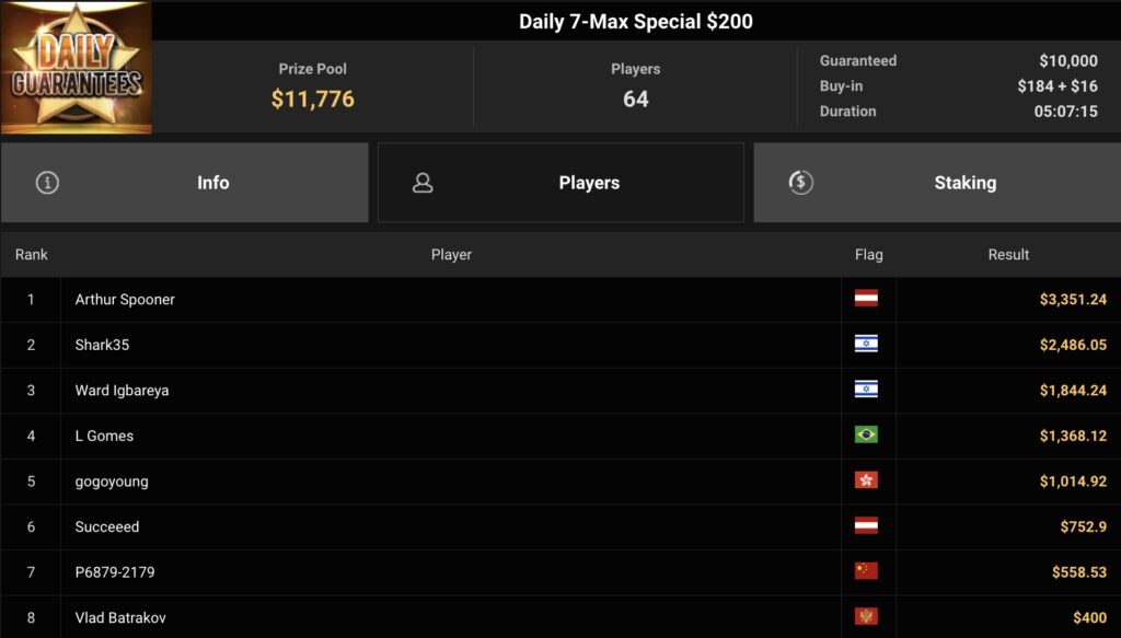 Das $200 Daily 7-Max Special fand 64 Entries und somit wurde ein $11.776 Preispool geschaffen. Der größte Anteil ging hier an den Österreicher ‚Arthur Spooner‘. Er konnte $3.351 für den Sieg mit nach Hause nehmen.