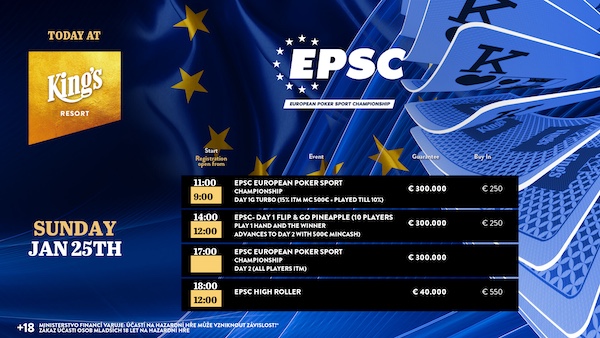 Im King’s Resort Rozvadov drehte sich gestern beim laufenden European Poker Sport Championship (EPSC)-Festival alles um das €250 Main Event – flankiert von einem Side Event. Neben zwei weiteren Starttagen im Main Event standen ein PLO Turnier auf dem Programm.
