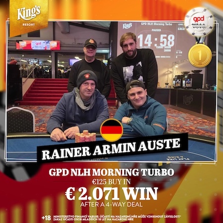 Bereits am Vormittag wurde beim €125 GPD NLH Morning Turbo (€10.000 GTD) ordentlich Gas gegeben. 98 Spieler sorgten gemeinsam mit 18 Re-Entries für einen Preispool von €12.180, der auf die Top 18 Plätze verteilt wurde – die Garantie war damit klar übertroffen.