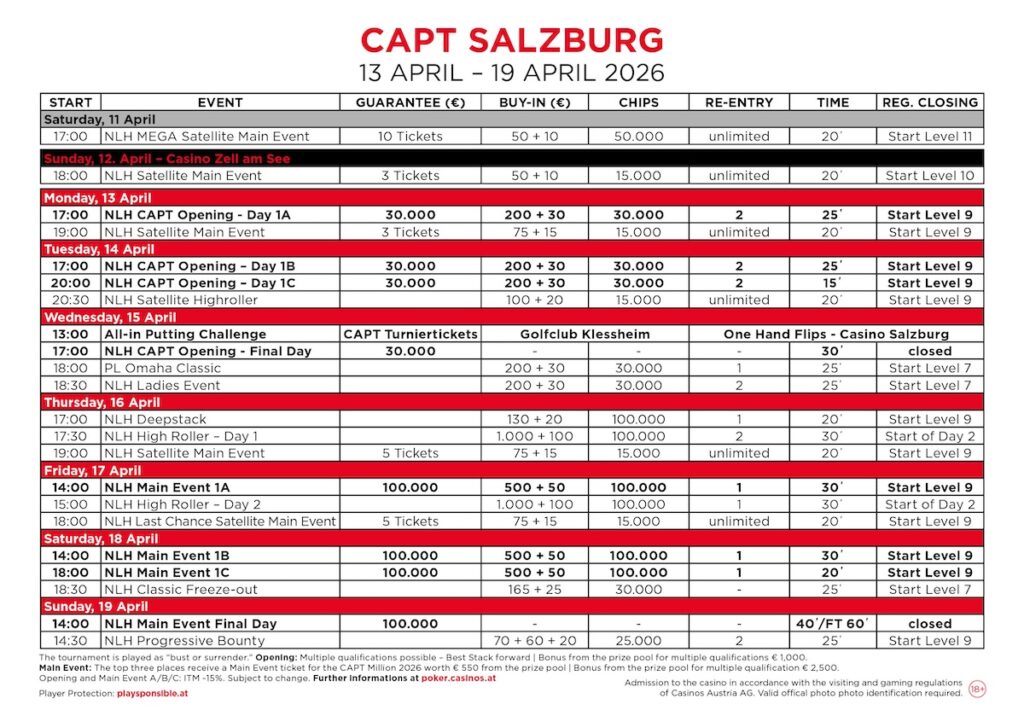 Vom 13. bis 19. April werden wieder die Karten für Casinos Austria Poker Tour (CAPT) in Salzburg ausgeteilt.