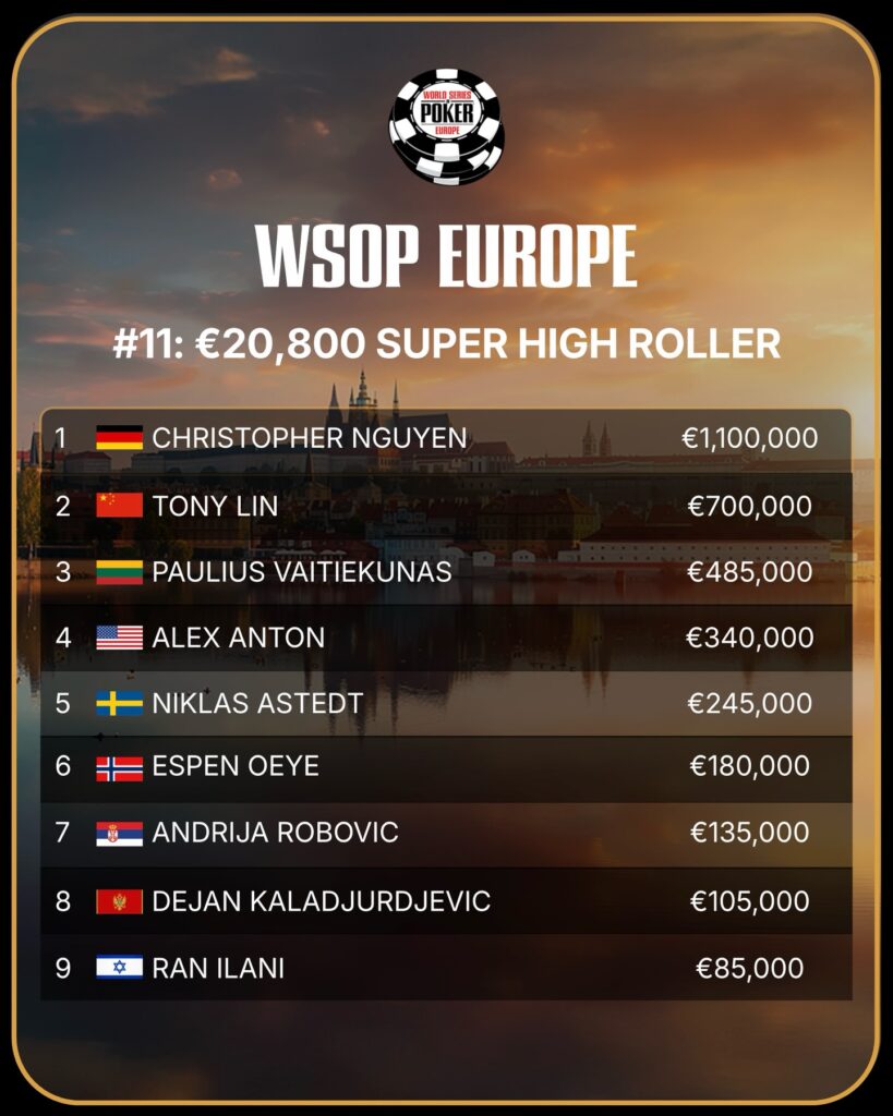 Trotz dieses Rückschlags kämpfte sich der Deutsche zurück ins Turnier und erreichte schließlich das entscheidende Duell gegen Ren Lin. Dort fiel die Entscheidung in einer Hand, in der Nguyens K♠7♥ gegen Lins T♣9♠ standhielt – das Board brachte A♠5♥2♣2♦K♥ und besiegelte den Turniersieg.