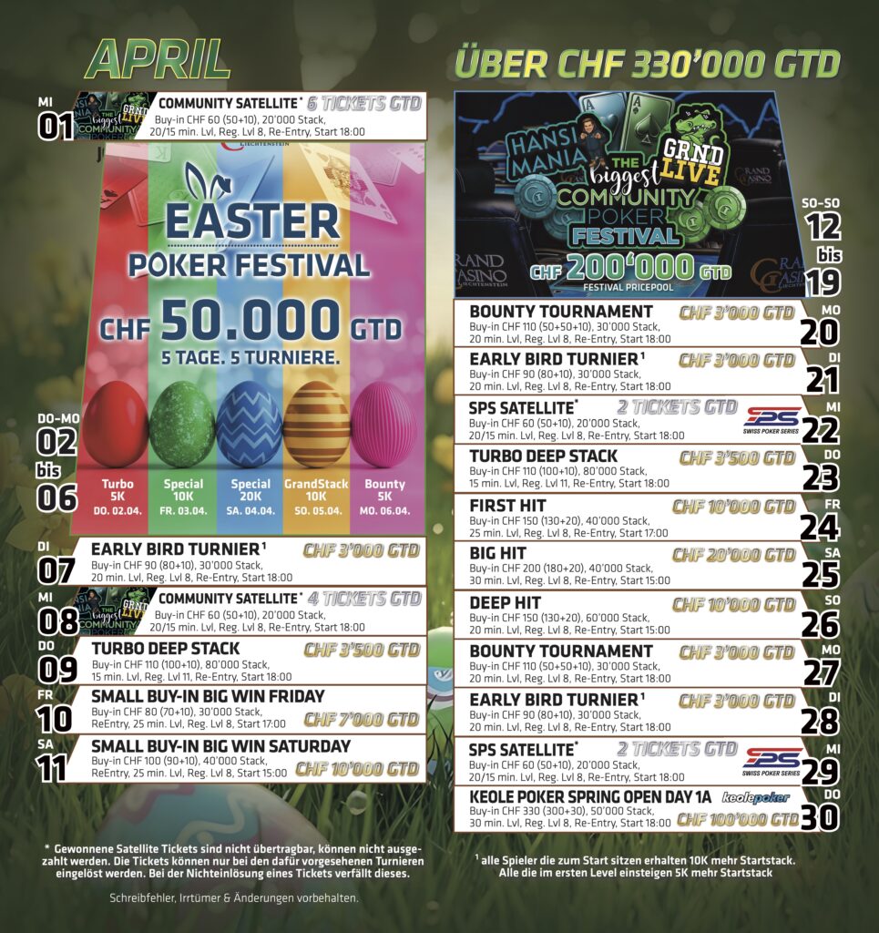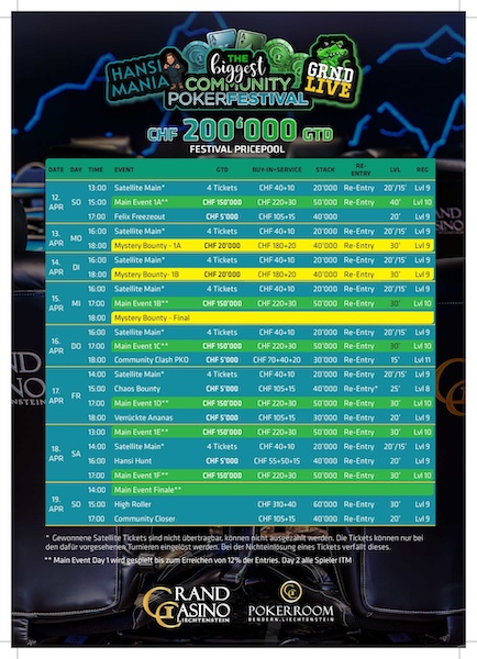 Im Grand Casino Liechtenstein (GCLI) läuft aktuell das Community Festival, das von Felix Schneiders GRND LIVE sowie Jan „HeyHansi“ Wagner präsentiert wird. Gestern wurde der erste von zwei Starttagen im Mystery-Bounty-Turnier gespielt.