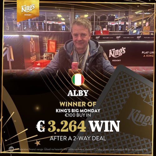 Am Abend stand mit dem €100 King’s Big Monday (€10.000 GTD) ein weiteres Turnier auf dem Plan. 112 Spieler sorgten mit insgesamt 176 Entries für einen Preispool von €14.784.