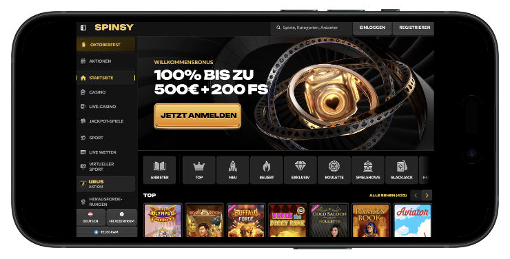 Spinsy ist zwar kein Casino ohne Mindesteinzahlung, dafür aber ein echtes Power-Casino, das mit einem 100%-Bonus bis zu 500 € und 200 Freispielen überzeugt. Die Spielauswahl ist herausragend, mit beliebten Titeln wie Big Bass Vegas, Gates of Hades und exklusiven Slots wie Cash of Egypt. Aber nicht nur Aviator-Fans kommen hier auf ihre Kosten – das Live-Casino bietet Highlights wie Mega Ball, Cash or Crash und Monopoly Live.