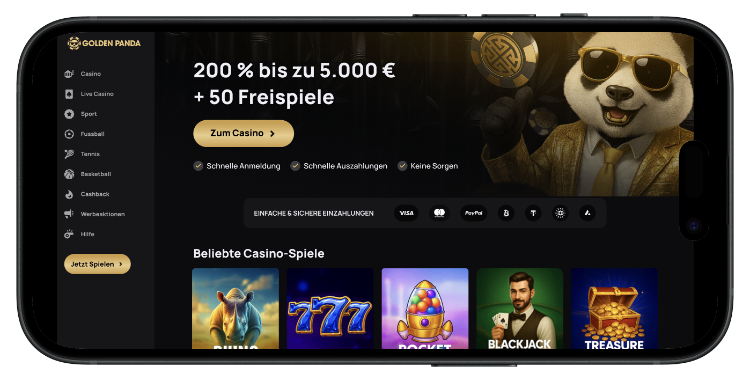 | Golden Panda | 200 % Casino Bonus bis zu 5.000 Euro + 50 Freispiele | Hoch modernes Online Casino mit attraktivem Cashback ohne Umsatzbedingungen |