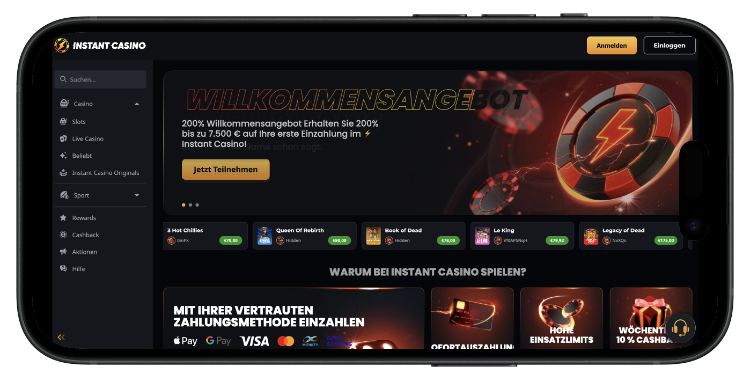 | Instant Casino | 200% bis zu 7.500 Euro | Kommt mit einer ganzen Reihe an Vorteilen wie etwa sofortigen Auszahlungen, einem Cashback und einem Top Bonus für Neukunden |
