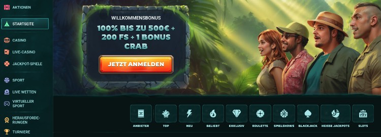 - 100 % Bonus bis zu 500 Euro, 200 Freispielen und Bonus Krabbe