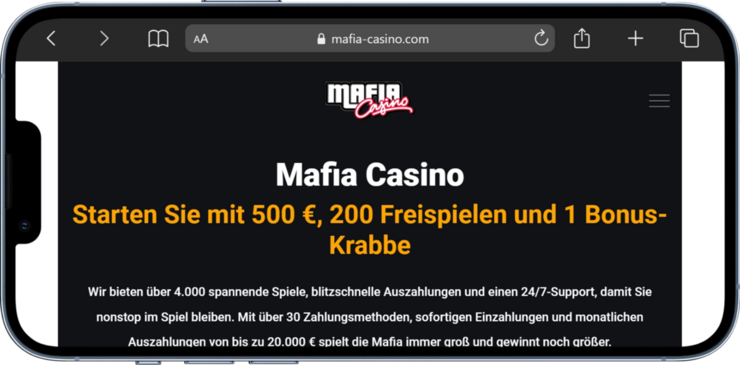 Mafia Casino spielt ganz vorne mit und sichert sich verdient den 2. Platz im Luxemburg Online Casino Vergleich. Die Plattform ist vollgeladen mit Angeboten, Specials, Extras und auch einem Sportbereich. Neben klassischen Boni und Turnieren erwarten dich tägliche Bonus Crab, Herausforderungen und zusätzliche Rewards.