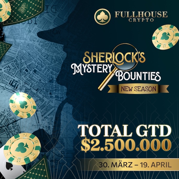 Auf der Plattform FullHouse Crypto (FHC) läuft bald mit den Sherlock’s Mystery Bounties eine mehrwöchige Turnierserie, die vom 30. März bis zum 19. April angesetzt ist. Insgesamt werden dabei $2.500.000 garantiert, zusätzlich locken Mystery-Bounties von bis zu $4.500+.