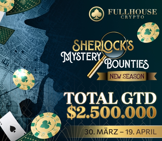 Auf der Plattform FullHouse Crypto (FHC) läuft bald mit den Sherlock’s Mystery Bounties eine mehrwöchige Turnierserie, die vom 30. März bis zum 19. April angesetzt ist. Insgesamt werden dabei $2.500.000 garantiert, zusätzlich locken Mystery-Bounties von bis zu $4.500+.