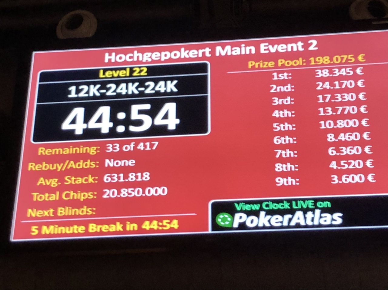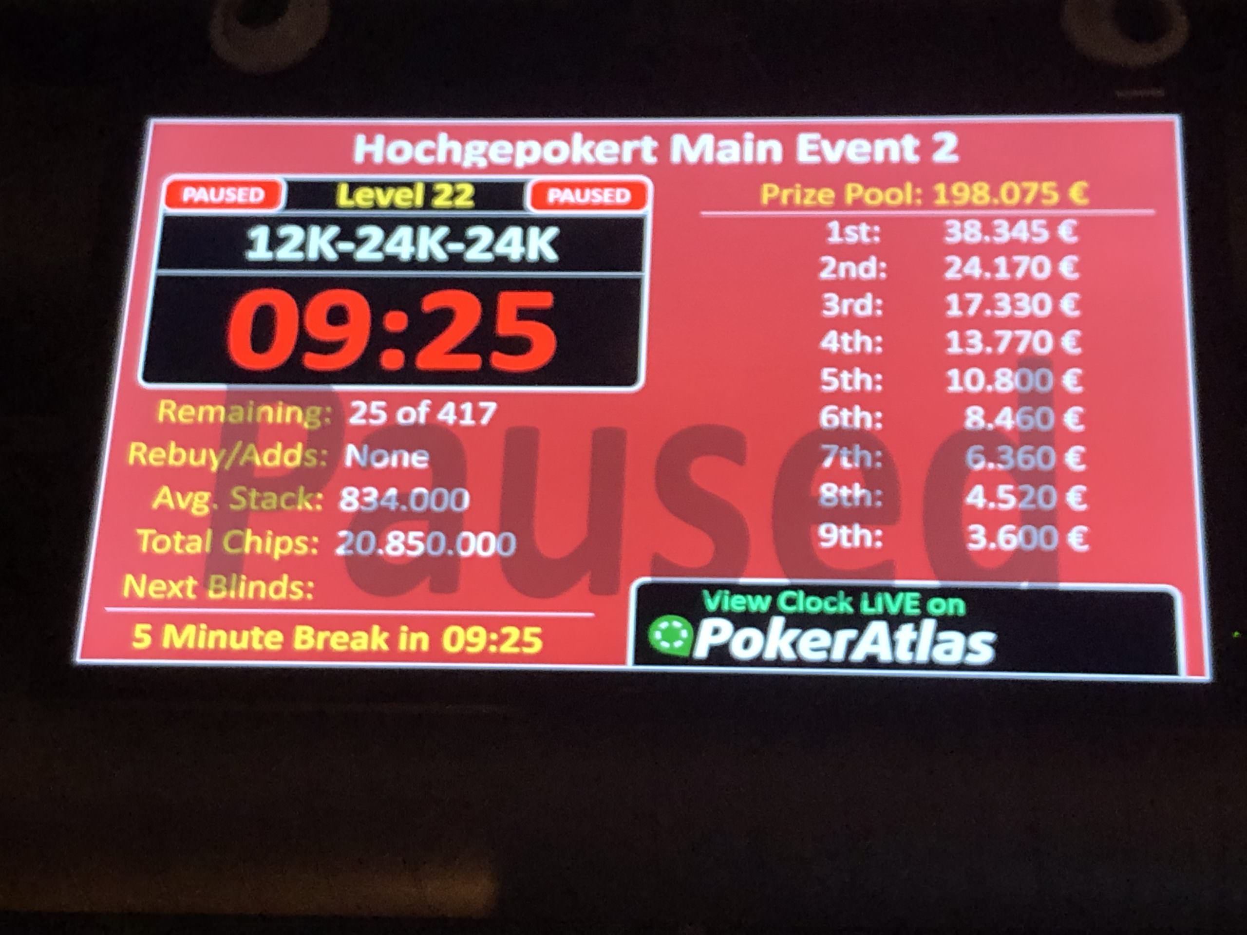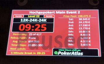 25 Spieler haben Tag 2 überlebt und gehen morgen ab 16:00 Uhr bei Blinds von 15.000/30.000-30.000 in das Finale bei dem €38.450 auf den Sieger warten. Der Durchschnittsstack liegt bei 834.000 Chips.