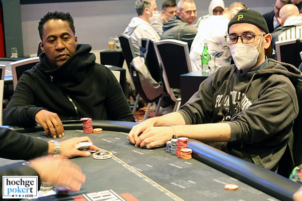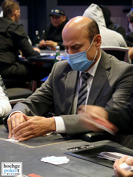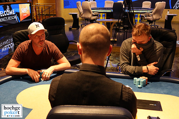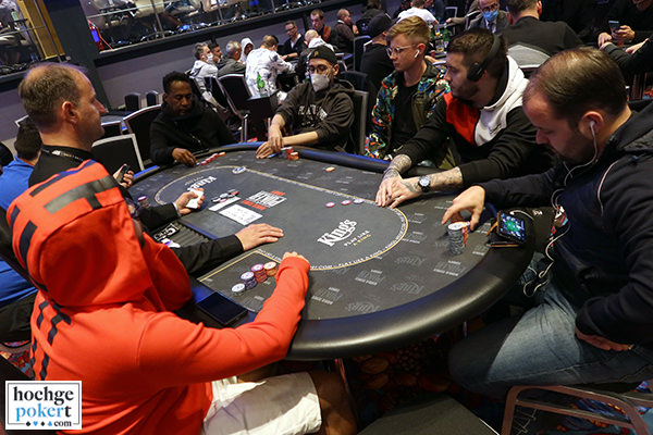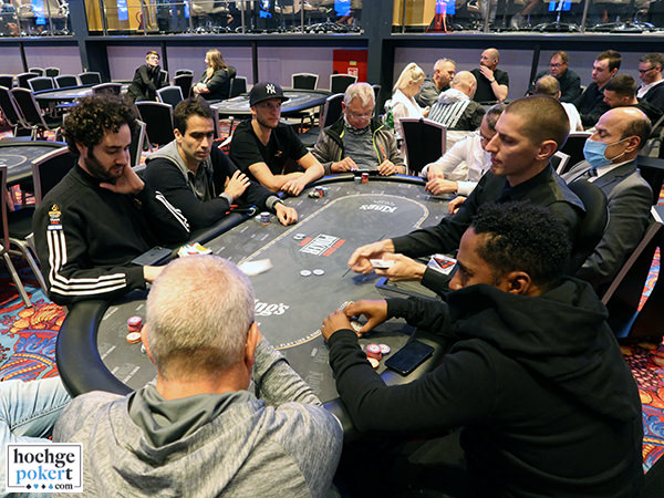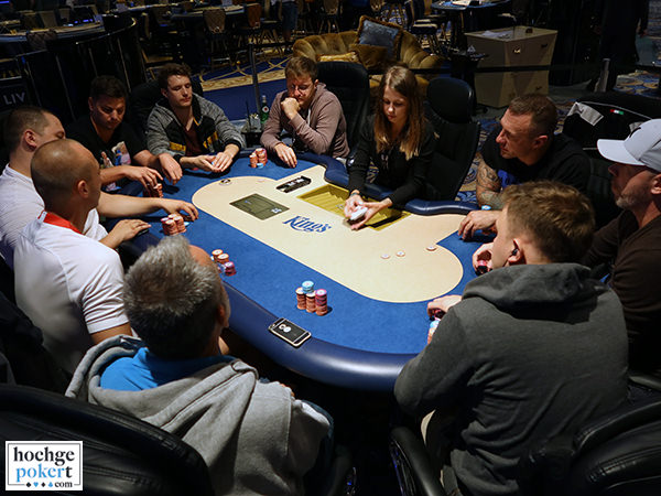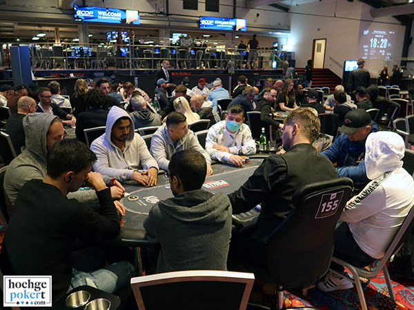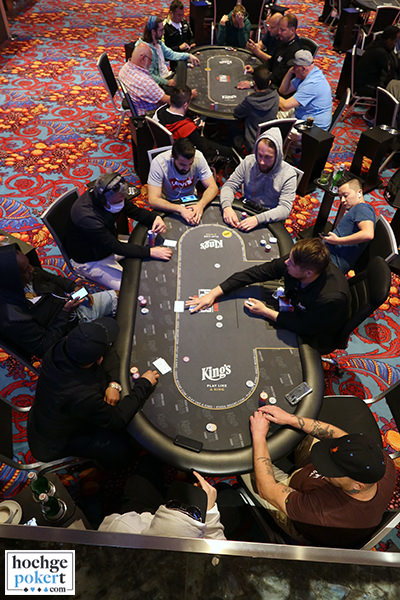 "Last four hands" wurden angekündigt. Das bedeutet, jeder der drei Tische spielt jetzt noch exakt 4 Hände bevor das Turnier für heute gestoppt wird.