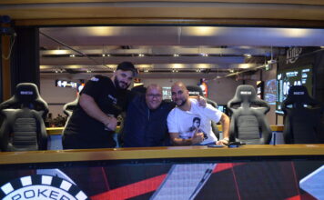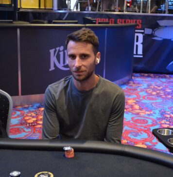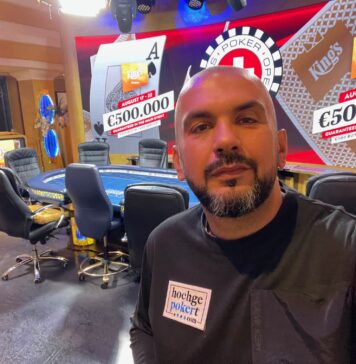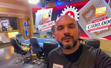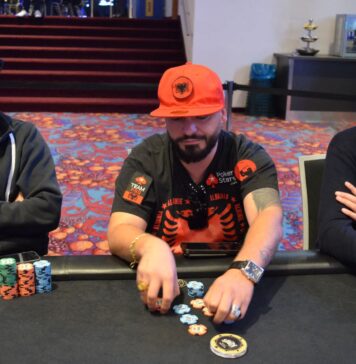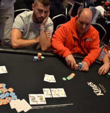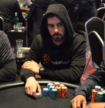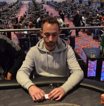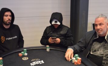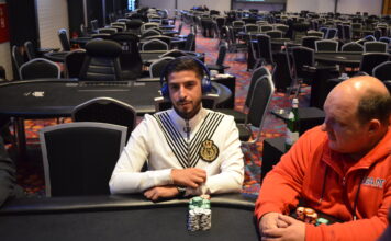 Preflop wandert der Stack von 990.000 Chips in die Mitte nach einem Openraise aus UTG und einem Flatcall aus UTG+1. In später Position stellt Fabio Sciolti seinen Stack von 1,1 Mio. ebenfalls in die Mitte rein.