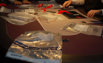 An den ersten Tischen werden schon die Tüten für Tag 2 am Sonntag gepackt. In der allerletzten Hand dezimierte sich das Teilnehmerfeld auf 16 Überlebende aus Flight B. Damit können viele der Survivors am Sonntag über große Stacks verfügen ... und so viel sei verraten: 2 MonsterStacks kommen mit jeweils über einer halben Million Jetons auch aus dem Flight 1B!