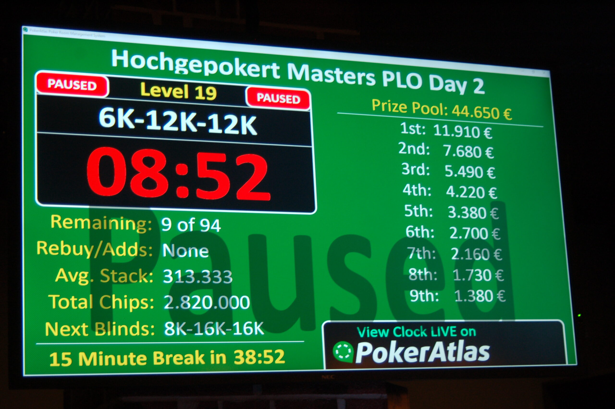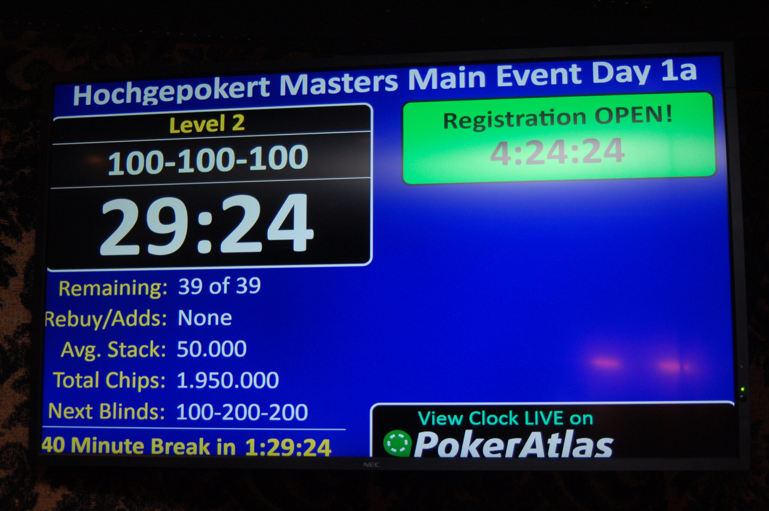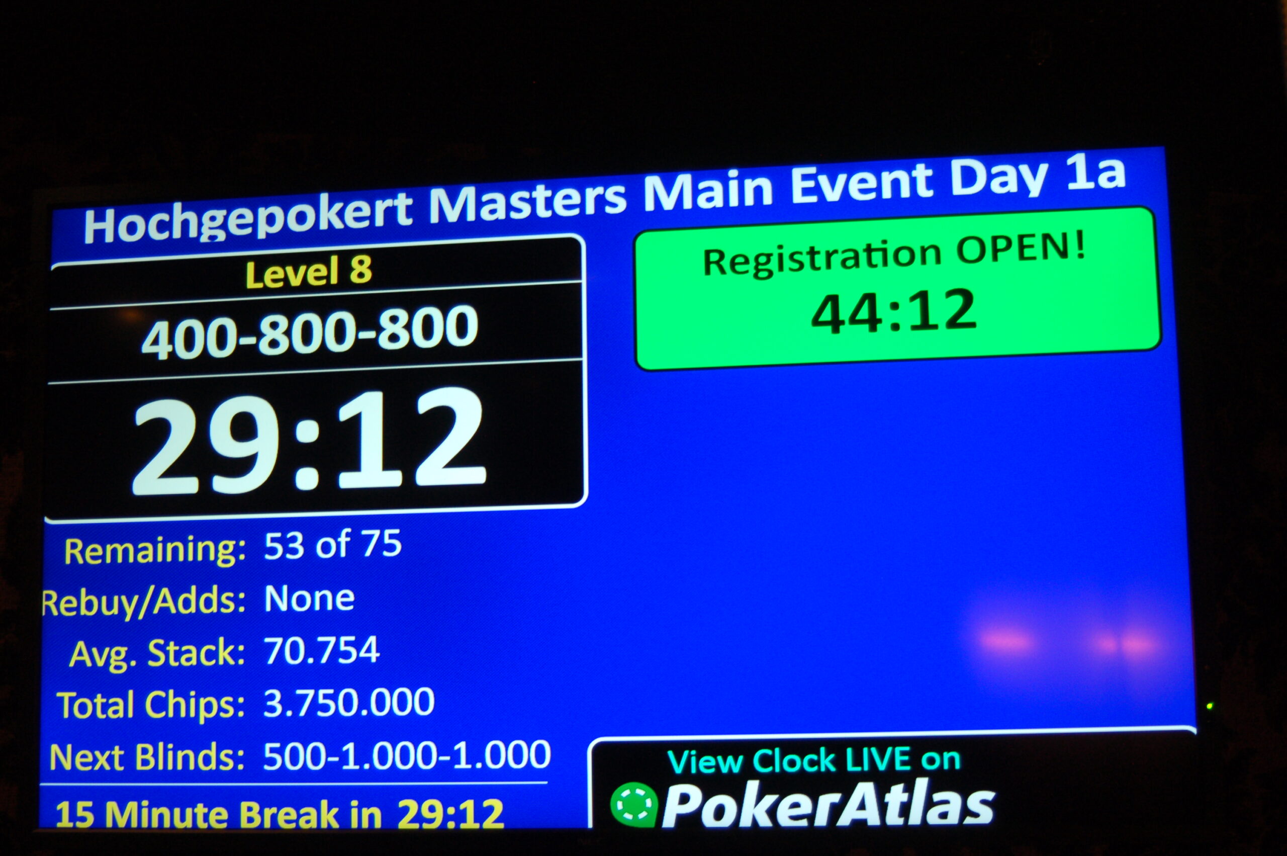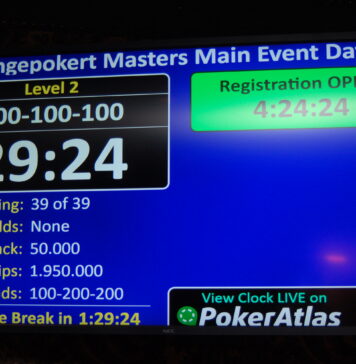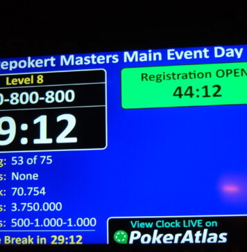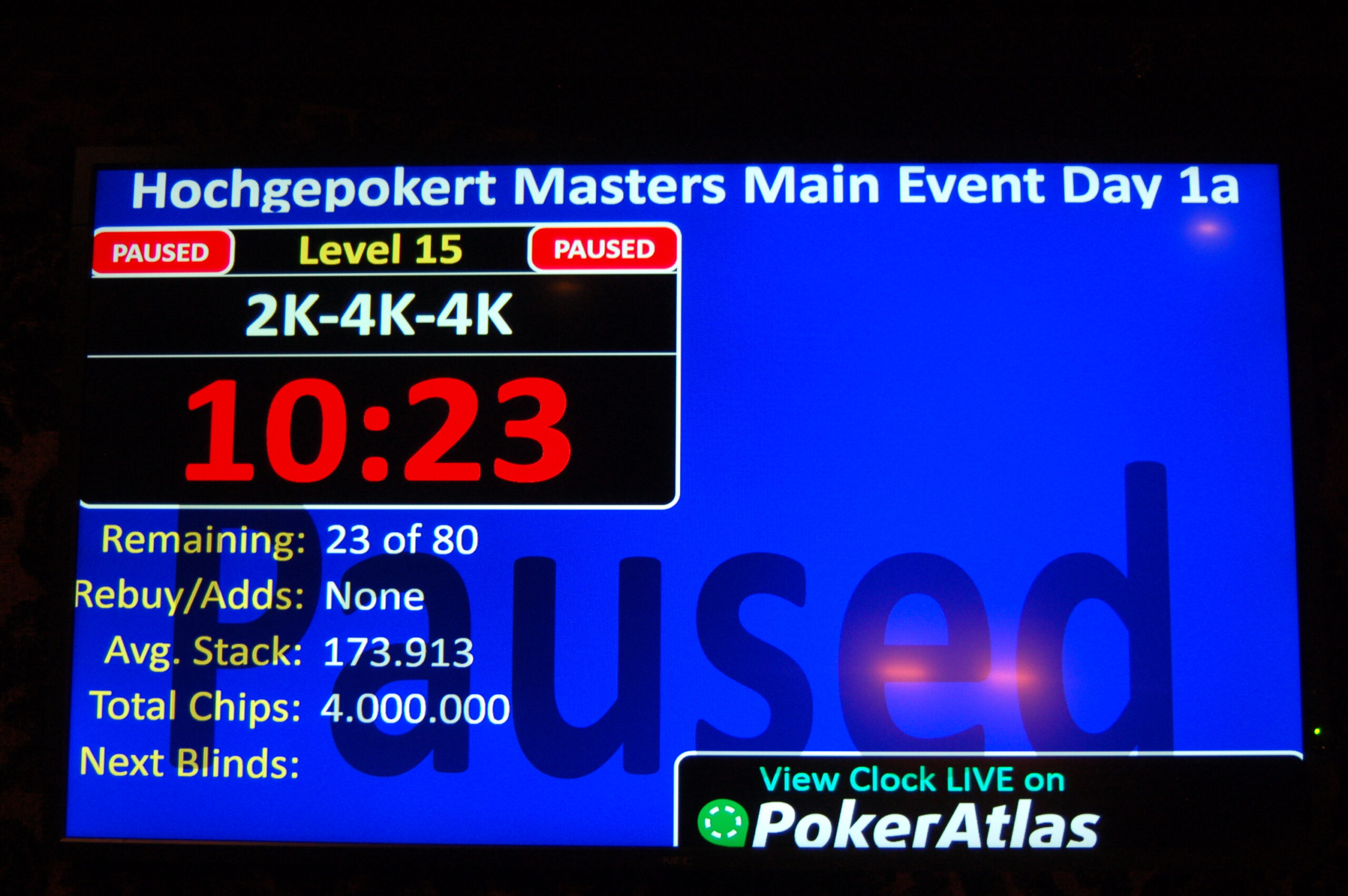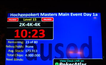 Wie am Ende jedes Start Flights üblich, wird auch heute die Turnieruhr kurz vor dem Ende angehalten und ausgelost, wie viele Hände noch zu spielen sind. An Main Event Tag 1a sind es: 3!