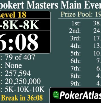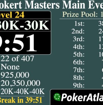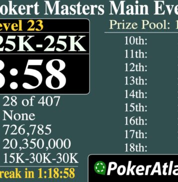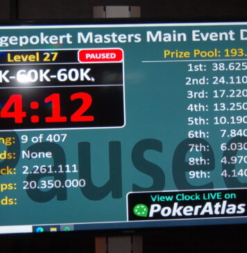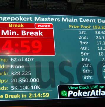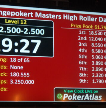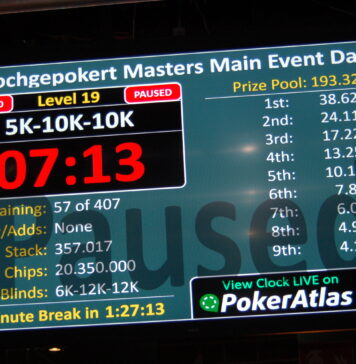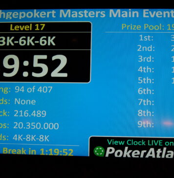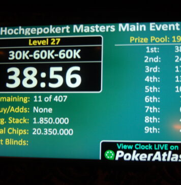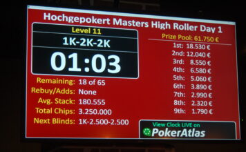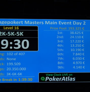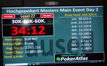Das Turnier wird morgen um 16:00 Uhr mit 34:12 Minuten Restspielzeit in Level 27 bei Blinds 30.000/60.000-60.000 fortgesetzt. Für die 9 verbleibenden Spieler beträgt der Chipaverage 2.261.111, was 38 BBs entspricht.