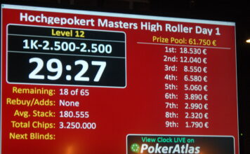 Tag 1 im €1.100 PLO High-Roller ist in den Büchern und in den letzten beiden Leveln hat sich das Teilnehmerfeld innerhalb von 60 Minuten von 29 Spielern auf nur noch 12 reduziert. Das heißt auch, dass wir morgen nur noch 3 Bustouts von den Preisgeldrängen entfernt sind, die bei €1.790 Mincash beginnen und bei der Siegprämie von €18.530 aufhören.