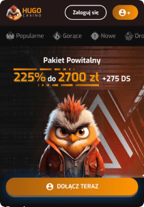 - Hugo Casino – pakiet 225% + 275 DS, cashback 20%, bonusy tygodniowo
